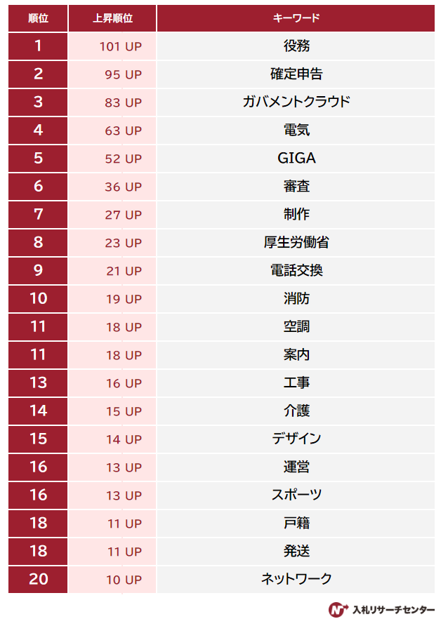 ・入札情報速報サービスNJSSユーザーが検索したキーワードを元に、前月と比較して上昇幅の大きいキーワードをランキング